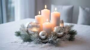 Layer faux snow, moss, and miniature trees inside a large glass vase or jar. It’s an easy DIY that instantly brings winter wonderland charm indoors.