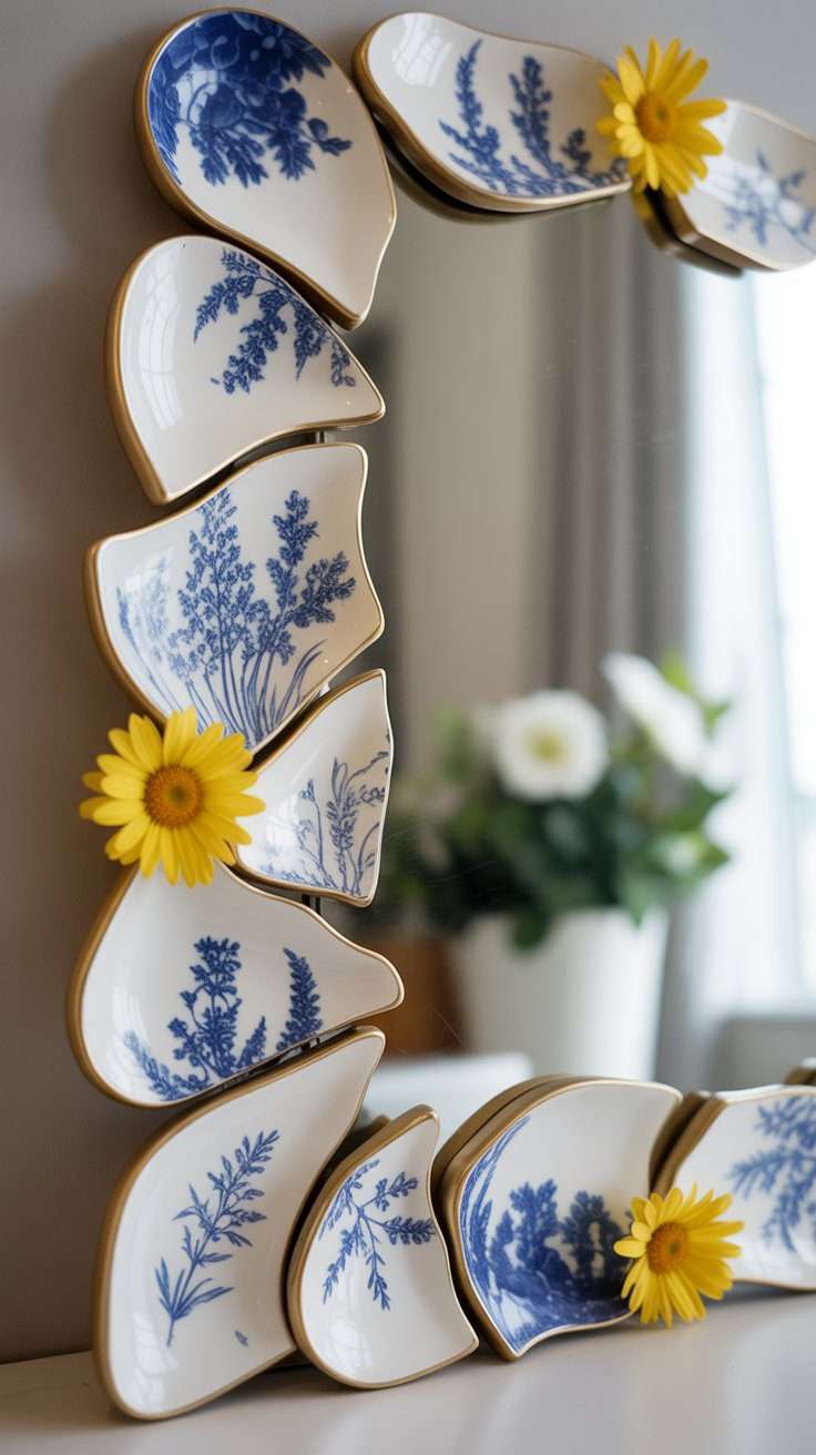 Mirrors always make a room feel a little brighter, and adding broken china around the frame makes them even more special. The finished look can be vintage, romantic, or artsy depending on the colors you use.