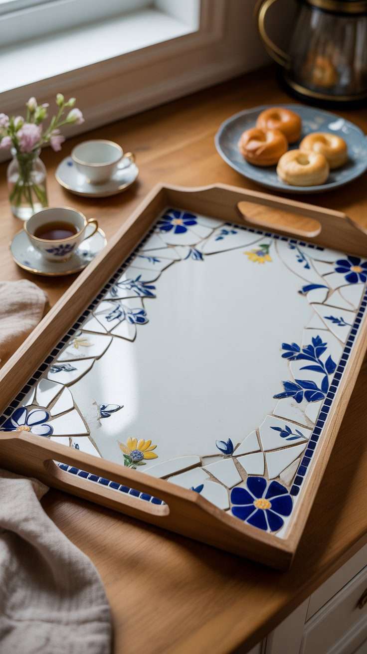 This might be one of my favorite ideas in the whole list because it is both decorative and useful. A tray with broken china mosaic details can look so beautiful on a coffee table, vanity, or dining setup.