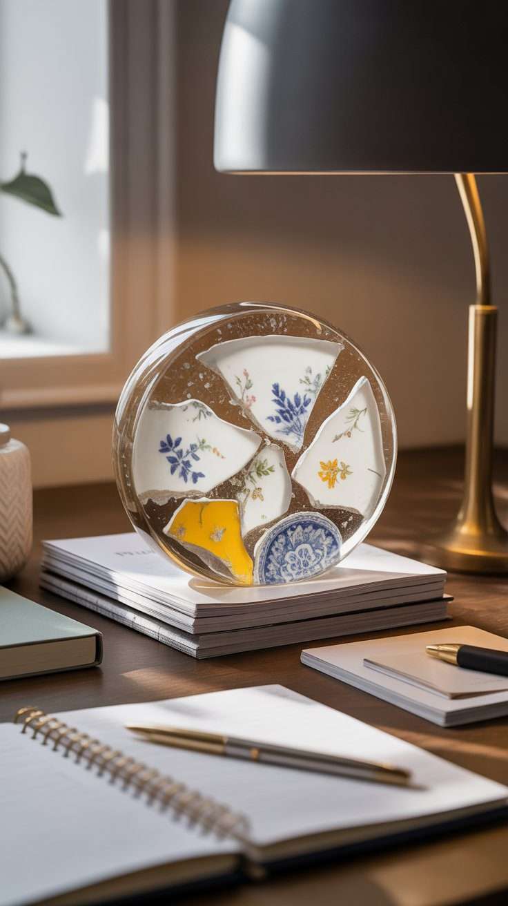 If you want a craft that feels a little more modern, resin paperweights are a really interesting option. Small china pieces suspended in resin can look artistic and polished at the same time.