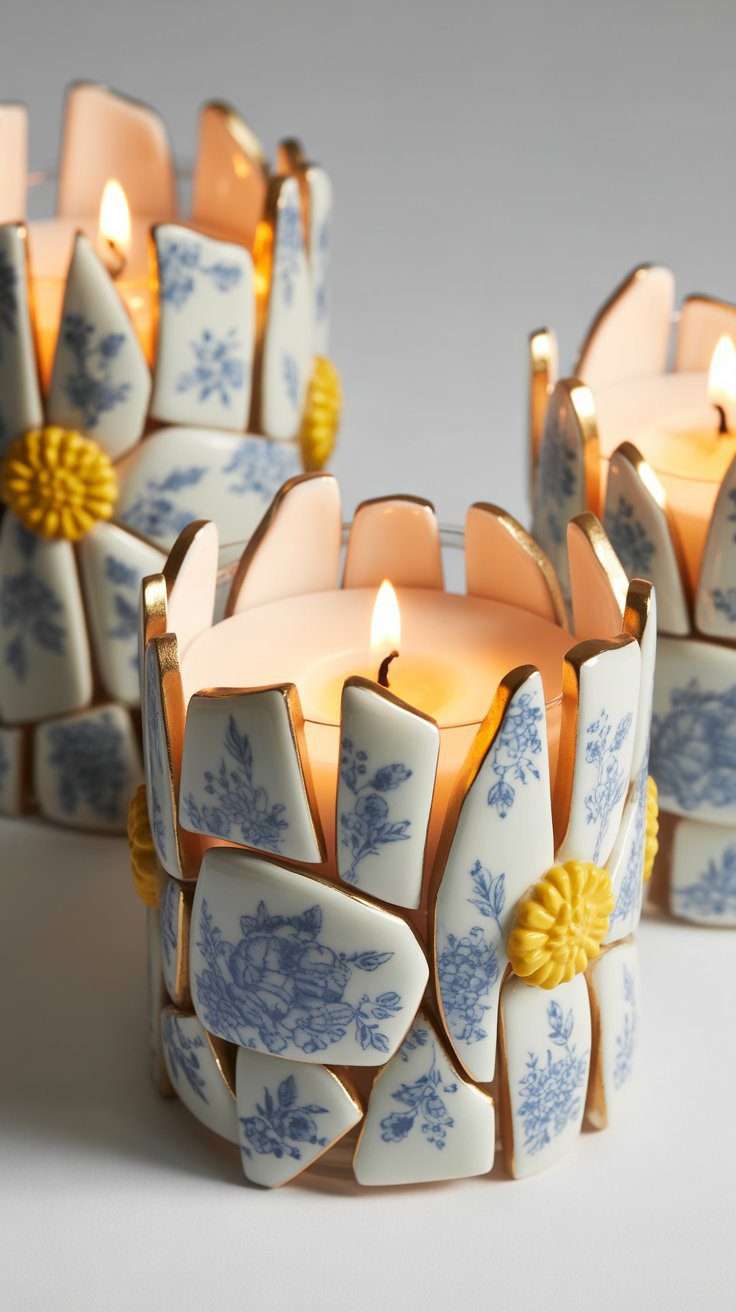 Broken china can make candle holders feel so much more decorative. Even a simple holder starts looking more detailed and interesting once you add mosaic pieces around it.