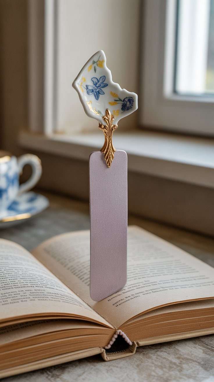 This idea feels so delicate and creative. A slim bookmark becomes much more special when the top is finished with a pretty broken china piece, especially if the pattern has florals, gold trim, or a vintage look. It turns a simple reading accessory into something that feels handmade, elegant, and perfect for gifting.