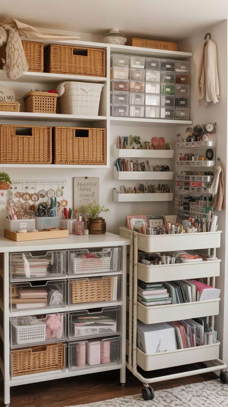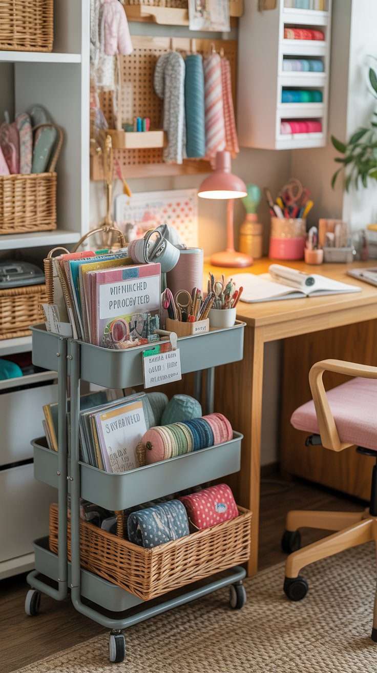A much better setup is to separate what you are using right now from what you are storing for later. Your current project should have its own basket, tray, drawer, or small cart so you can pause and come back without creating a mess across the whole room.