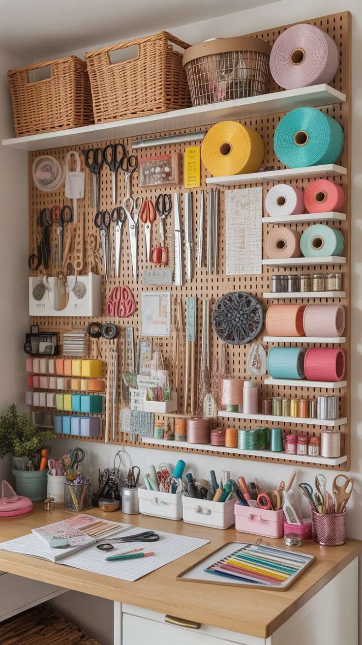 Vertical storage is one of the easiest ways to save space in a craft room without making the room feel heavier. Wall shelves, pegboards, hanging organizers, hooks, rail systems, and even mounted baskets can hold a surprising amount while keeping your floor clearer.