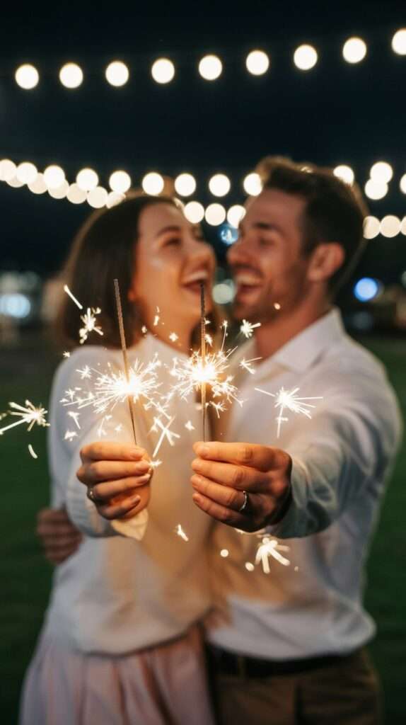 Sparklers bring joy, light, and movement into the photos. When the couple draws shapes or hearts in the air with sparklers, the long exposure turns the moment into a piece of art. The glowing lights beautifully reflect in their eyes and create a magical ending to the shoot.