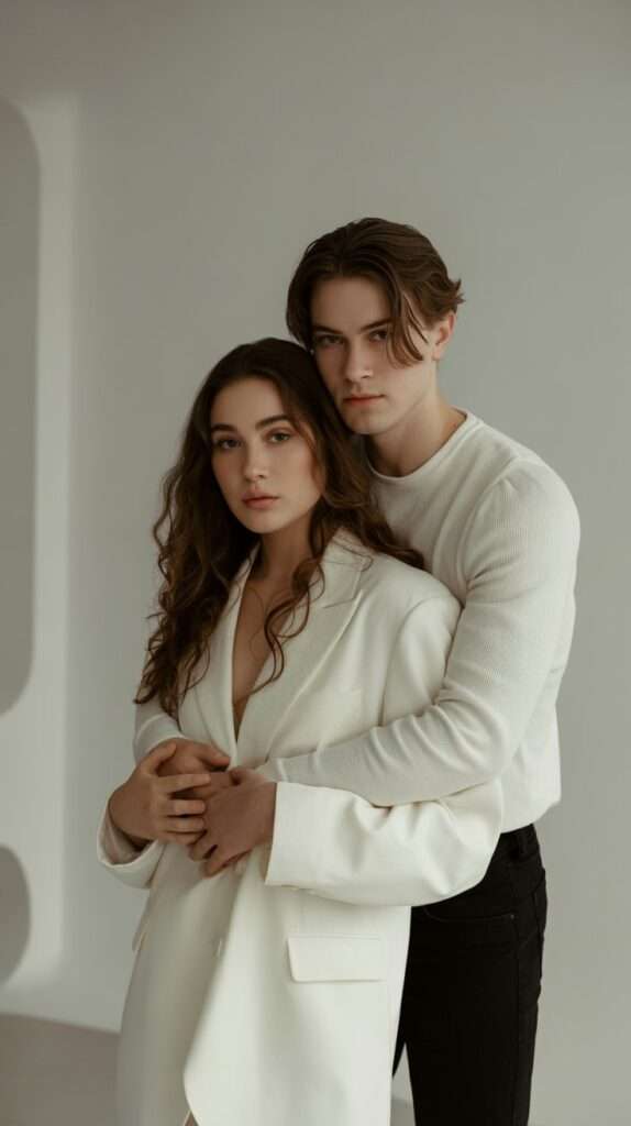 Simple background + dramatic lighting + elegant outfits. A minimalist studio shoot eliminates distractions and focuses entirely on emotion, body language, and connection. This creates magazine-style images that feel classic and timeless.