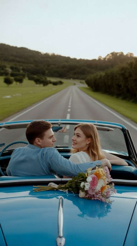 A classic car instantly transforms the shoot into a movie moment. The couple leaning against the hood, the bride touching up lipstick in the side mirror, both laughing with the wind blowing through the windows — it gives the vibe of we could drive anywhere, as long as it’s together. Black-and-white shots here are incredible.