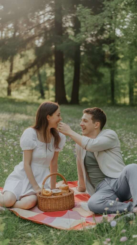 Choose a beautiful clearing in a forest, set up a picnic blanket with flowers, pastries, and sparkling drinks. The vibe is dreamy, intimate, soft, and whimsical — almost like stepping into a painting. When the couple interacts naturally — laughing, feeding each other, lying on the blanket — the photos feel candid and deeply romantic.