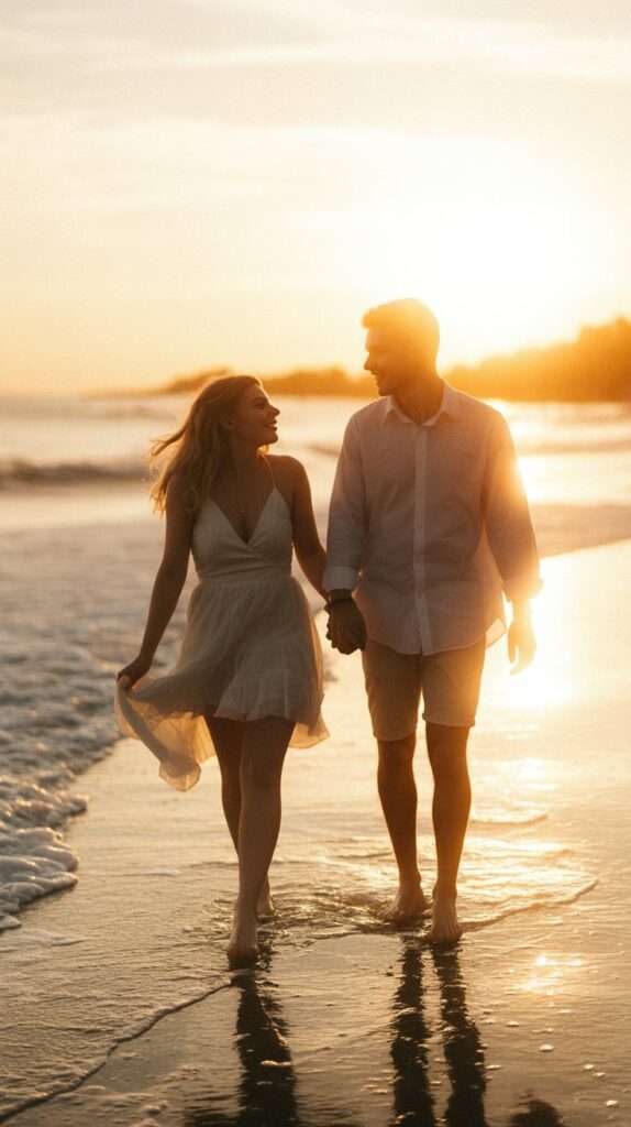 There’s something surreal about watching the waves roll in as the sun melts into the horizon. With warm orange tones reflecting on the water, the couple looks illuminated from behind — like a glowing silhouette. Walking barefoot in the sand, playing with the waves, holding hands… the photos capture pure spontaneity and tenderness. Beach shoots at sunset always feel cinematic, emotional, and timeless.
