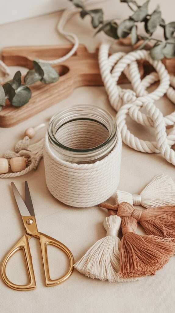 Step by Step: Cut 8 cords 3 ft each. Knot together at base of jar. Divide into groups, tie knots along sides. Gather cords above jar neck, knot together. Add loop for hanging.