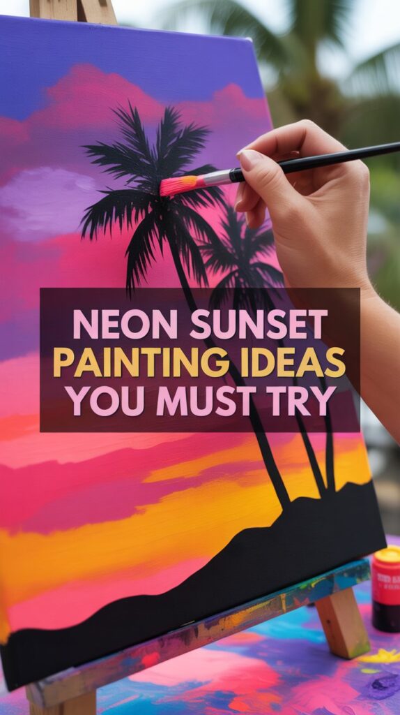 Paint your base sky in layers of neon acrylics, blending while still wet. Add bold black palm trees or a city skyline in the foreground to really let the neon tones pop.