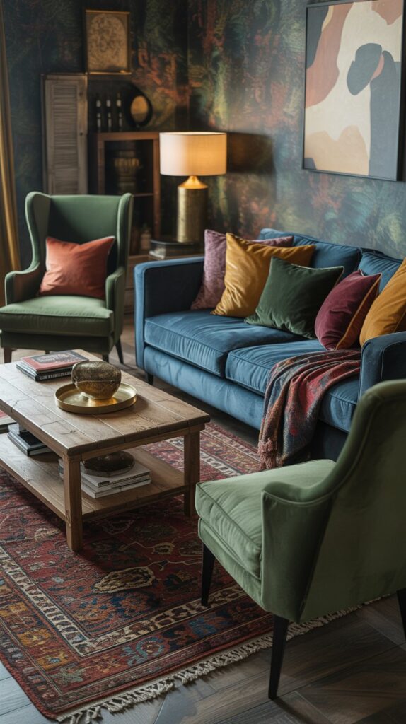 Balance bold with nature. An earthy living room with terracotta, olive green, and natural wood tones instantly grounds eclectic layers. Add a green sofa maximalist moment — think deep emerald or forest velvet — to connect the space with nature. Neuroscience shows green triggers calm, while earthy tones give stability, so this combo is powerful in busy eclectic spaces.