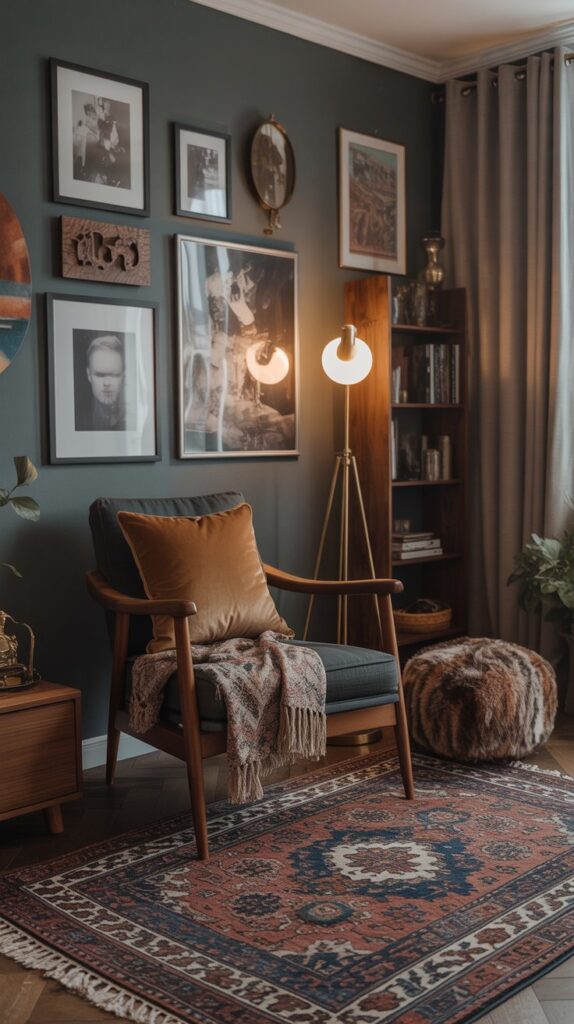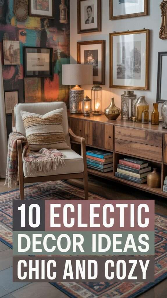 Walls are canvases for storytelling. An eclectic decor wall mixes old posters, modern prints, and vintage frames in asymmetry. The brain loves asymmetry because it feels dynamic and alive. Add in eclectic furniture ideas like a rustic bench under your gallery wall or a mid-century console with a funky lamp to tie the narrative together.