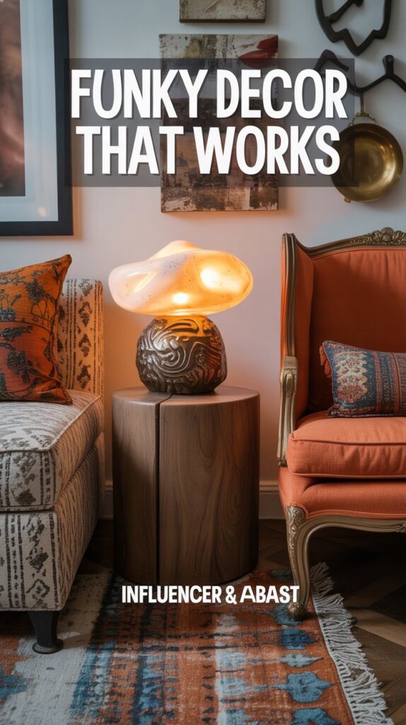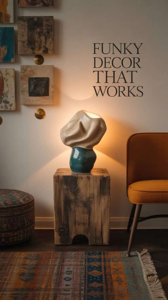 Adding “funk” doesn’t mean throwing random objects around. Funky house decor and funky eclectic decor thrive on surprise elements — a sculptural lamp, a patterned ottoman, or even a burnt orange vintage couch. The surprise factor activates curiosity and creates a space people want to explore. Pair funky with grounding pieces like a wood table or an earthy living room palette to maintain balance.