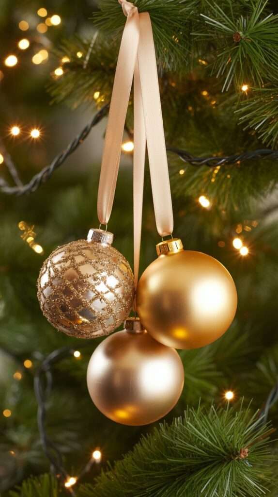 Rather than hanging ornaments one by one, cluster three ornaments of slightly different sizes together and attach them with ribbon or floral wire. This creates visual impact with fewer elements and makes each cluster feel intentional and sculptural. The gold ornaments reflect the lights from multiple angles, making your tree feel fuller and more glamorous — especially at night.