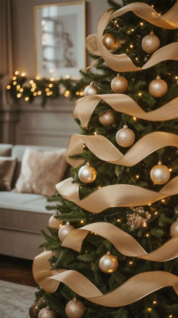 Instead of wrapping your tree with garland, use champagne-gold wired ribbon and weave it into soft, cascading waves around the branches. This creates movement and dimension, making your tree look styled by a professional decorator. Choose ribbons with different finishes — matte, glitter, and metallic — so the tree doesn’t look flat. Layer in glass ornaments and warm white lights and suddenly your tree feels like something straight out of a luxury boutique Christmas display.