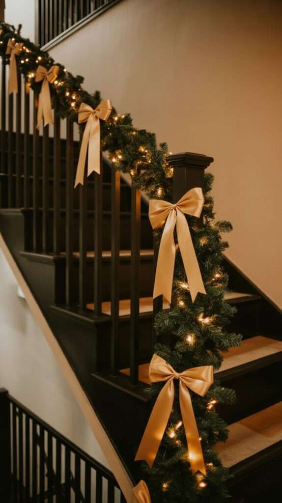 Wrap a metallic gold garland around the staircase railing and weave warm fairy lights throughout. The metal catches the light beautifully, turning the stairs into a glowing architectural feature. Add long satin bows at the ends for softness and fluidity. If you want something even more luxurious, layer eucalyptus or pine garlands underneath so you get greenery + gold shine in one moment.