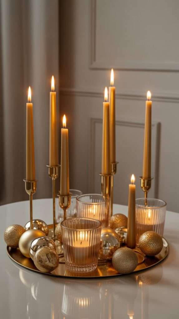 Candlelight and gold are the perfect holiday pairing. Arrange pillar candles of varying heights on a tray or elongated wood board. Mix them with small gold ornaments and clipped greenery for contrast. As the candles flicker, the reflections on the gold accents create a warm, romantic glow that makes your dining table instantly feel more elegant and intimate.
