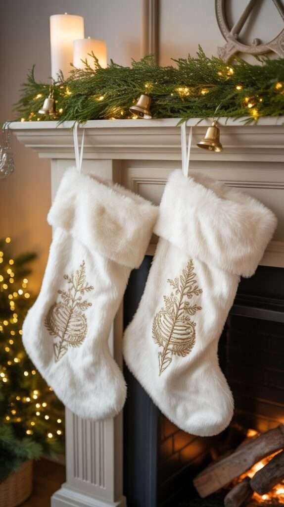 Swap out your traditional stockings for fluffy white faux fur ones, and add gold embroidery or gold name tags for a personalized touch. This simple replacement instantly elevates the entire fireplace area. The bright white and gold combo feels clean, chic, and wintery — more Aspen ski chalet and less traditional farmhouse.