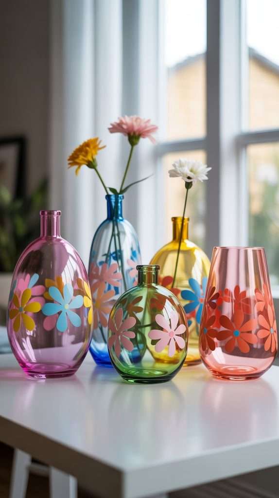 This is one of the prettiest ways to start with painted glass. Simple flowers, leaves, dots, or soft brushstrokes can make a plain vase feel so much more personal.