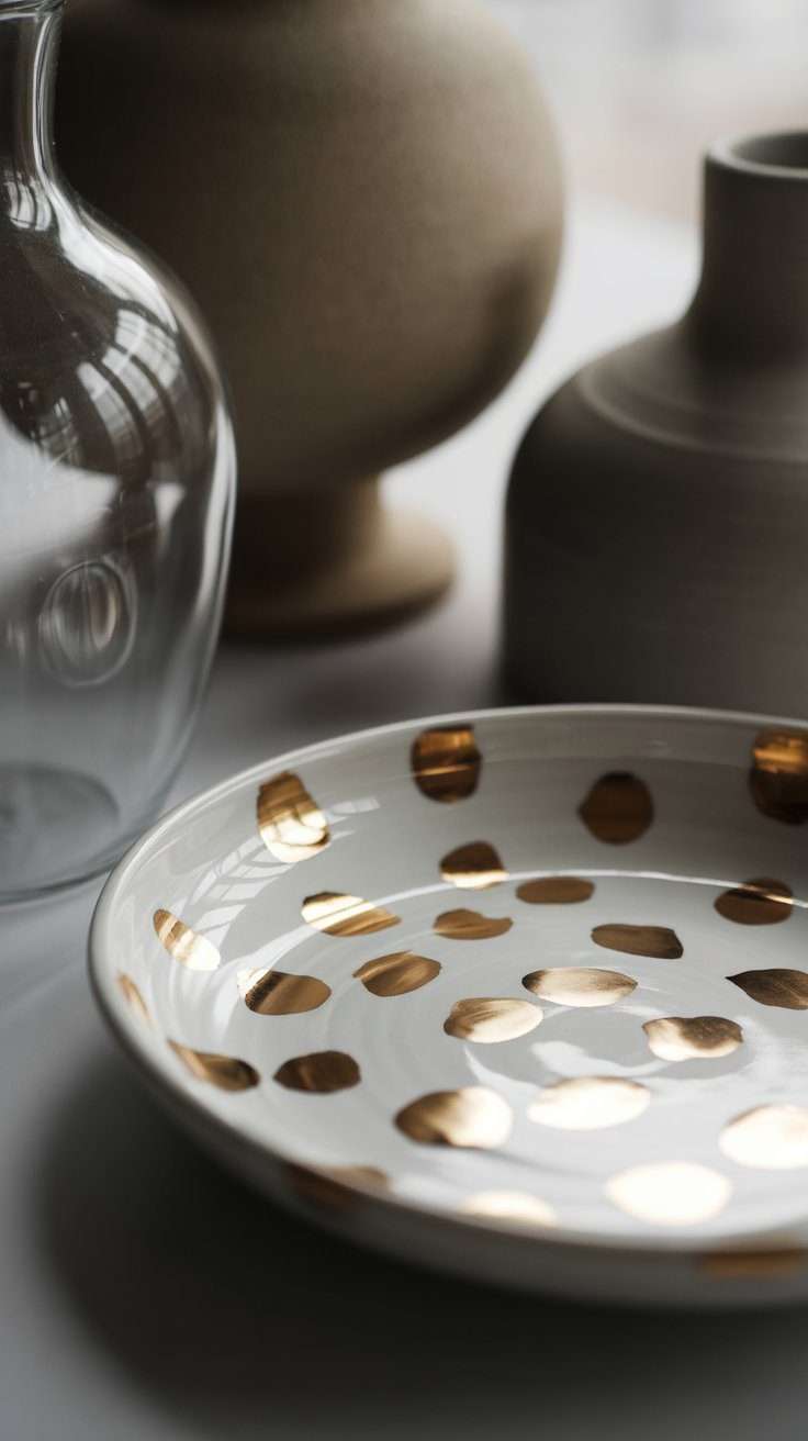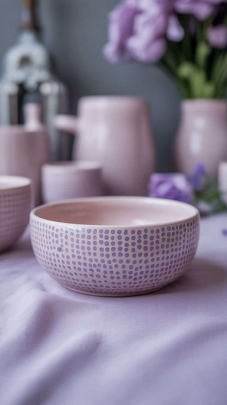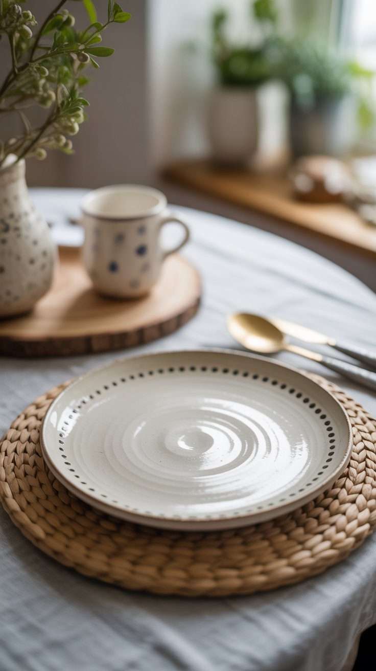 A dotted border looks especially sweet on pottery used on a circle table. It feels balanced, soft, and easy to style in a small cozy space.