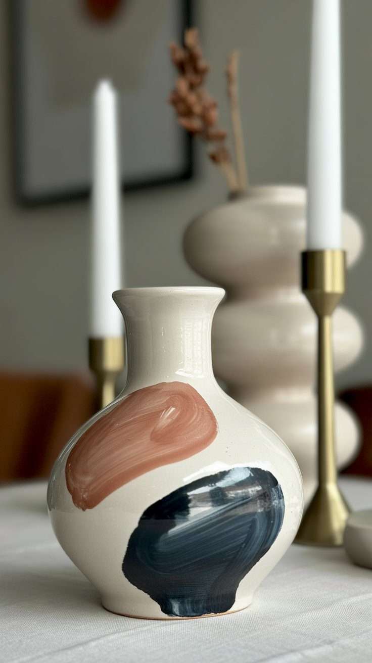 A painted abstract shape in the middle of a ceramic piece can work beautifully as part of a centerpiece. It has enough presence to stand out while still feeling clean and modern.
