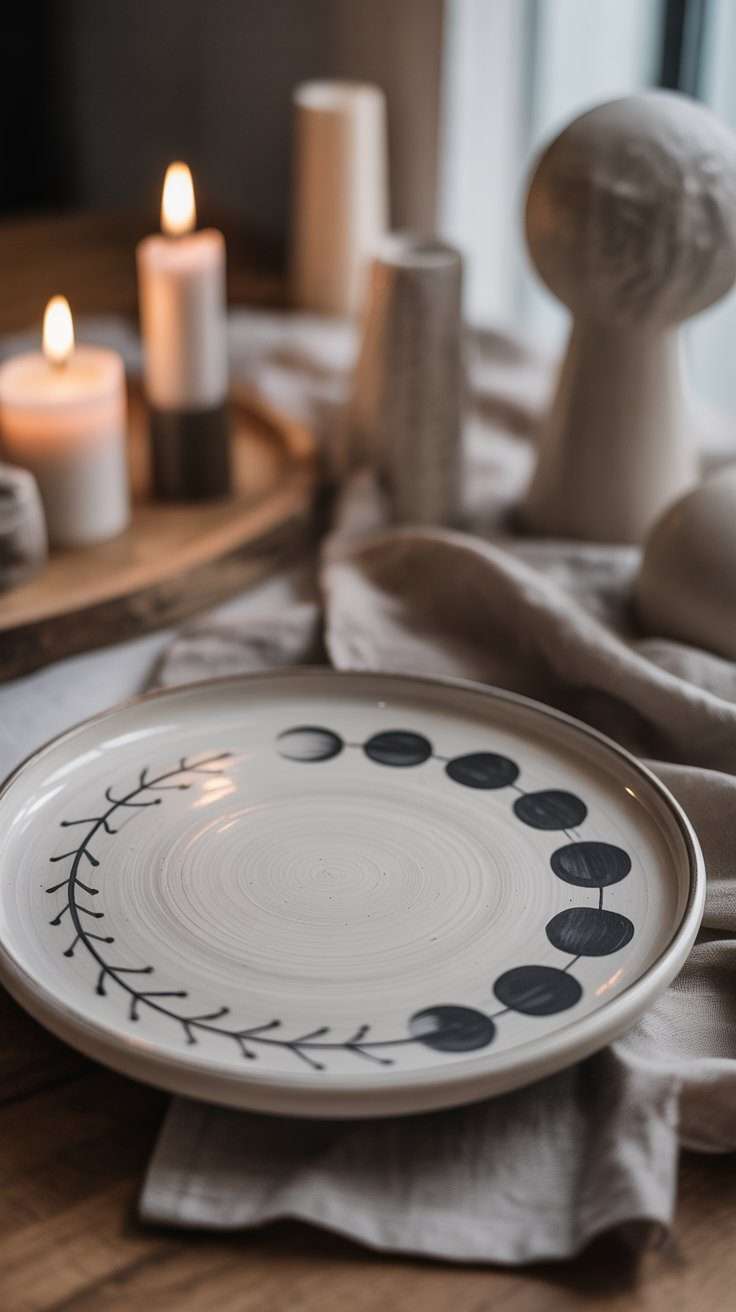 Line art, dots, arches, stripes, and tiny symbols are some of the easiest minimalist pottery designs for beginners.