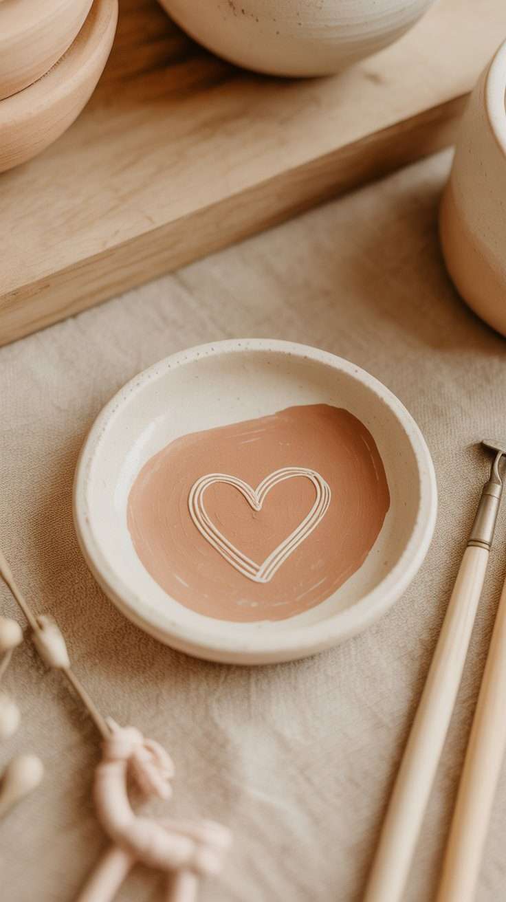 A tiny heart painted in the center of a ceramic dish is perfect for a jewelry tray. It keeps the piece delicate and useful while still looking sweet and minimal.