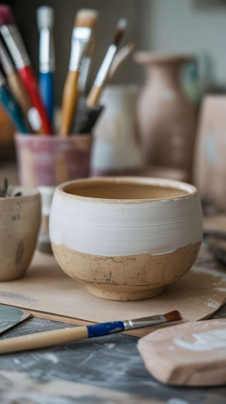 A few tiny daisy shapes can bring in a soft flower look while still keeping the pottery minimal. The secret is to leave plenty of blank space around them. For this kind of delicate pottery painting, I’d keep a few fine-detail tools close by. They make it much easier to create clean floral lines and soft organic details.
