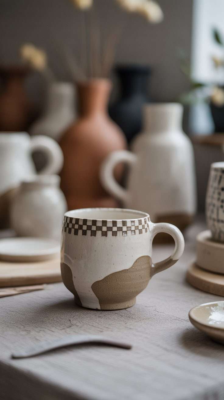 A small checker section near the rim or handle is another pretty take on minimalist pottery painting ideas. It adds a playful detail while still keeping the design clean and modern.