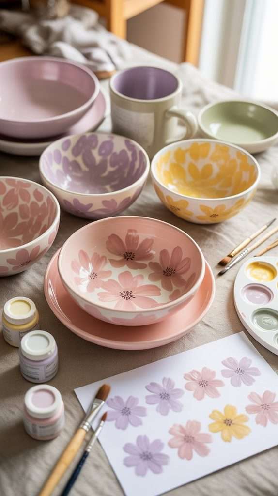 If you want your ceramic painting to feel delicate and pretty, pastel flowers are such an easy win. Try blush pink, soft yellow, lavender, and sage green on bowls, mugs, or little trinket dishes.