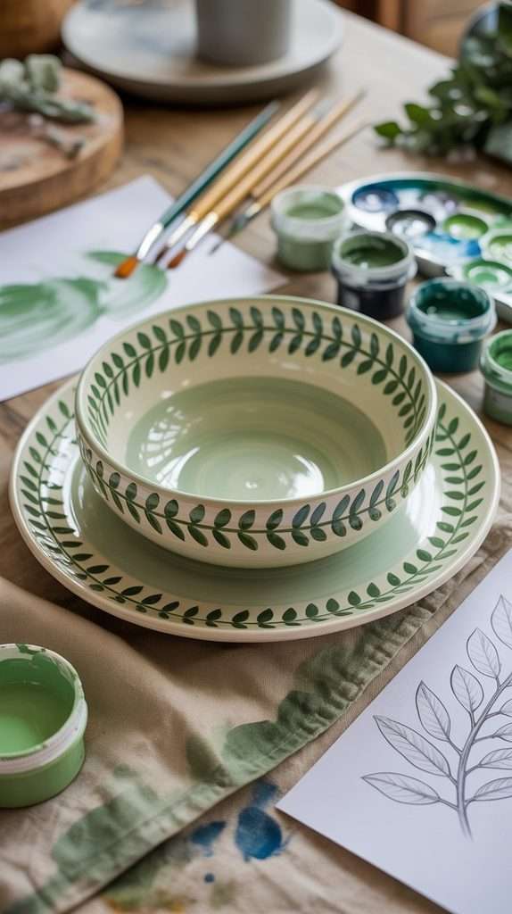 This is one of my favorite pottery painting ideas for plates and bowls. A soft leafy border looks natural, calming, and pretty without needing a lot of detail.