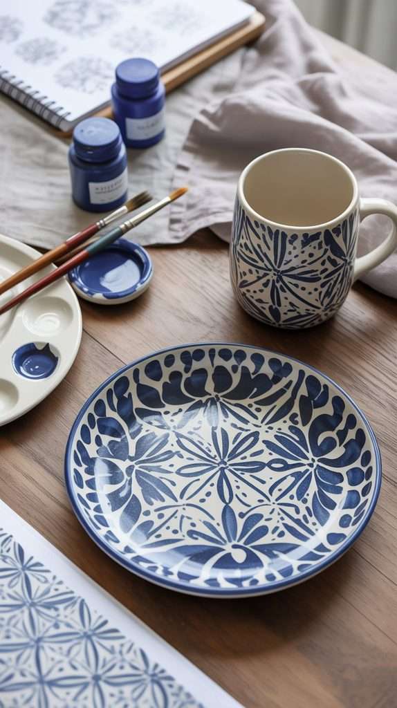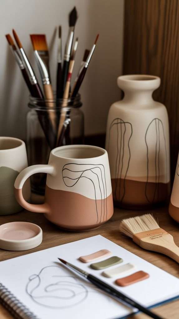 Loose brushstrokes can make ceramics look artsy without requiring a complicated design. Try soft layered strokes in terracotta, beige, olive, and dusty blue.