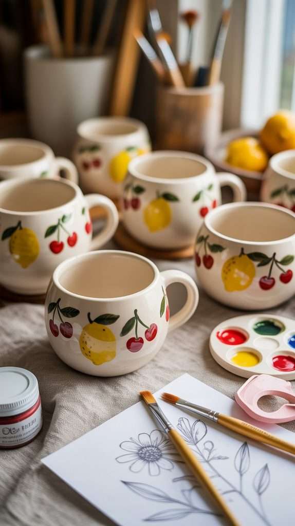 Little lemons, oranges, or even tiny cherries can make pottery feel cheerful and fresh. This kind of painted ceramic look is perfect for spring and summer.