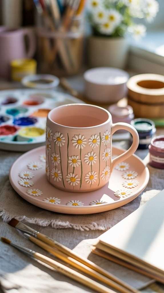 Tiny daisies around the rim of a mug or plate always look sweet. This is one of those easy pottery painting ideas that works even if you’re not confident with painting yet. Keep the petals loose and imperfect. That actually makes it look better.