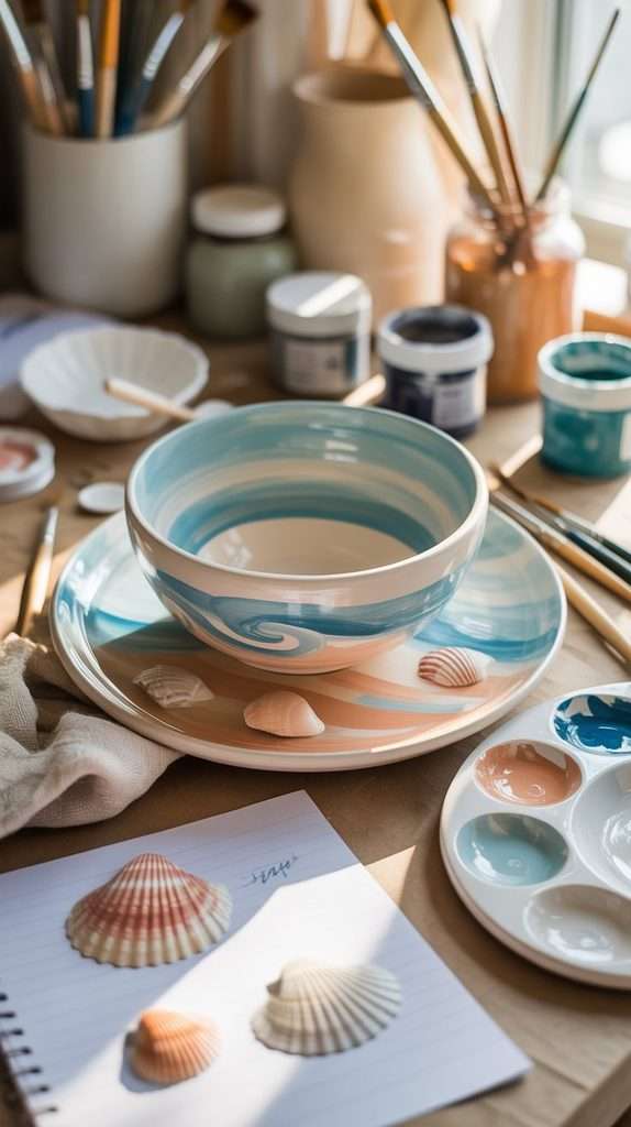 Soft waves, shells, and sandy colors are really pretty on ceramic bowls and plates. This idea has a relaxed coastal feel that works beautifully for summer decor.