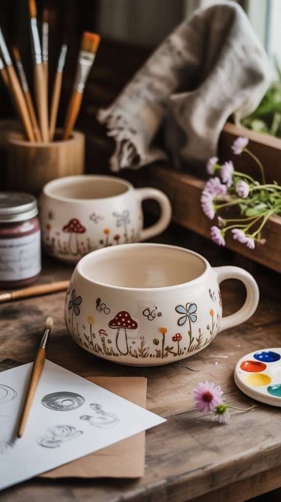 Little mushrooms, flowers, and tiny cottage-inspired details are everywhere right now, and they look so cute on ceramics. This is a fun direction if you want your pottery painting to feel whimsical.