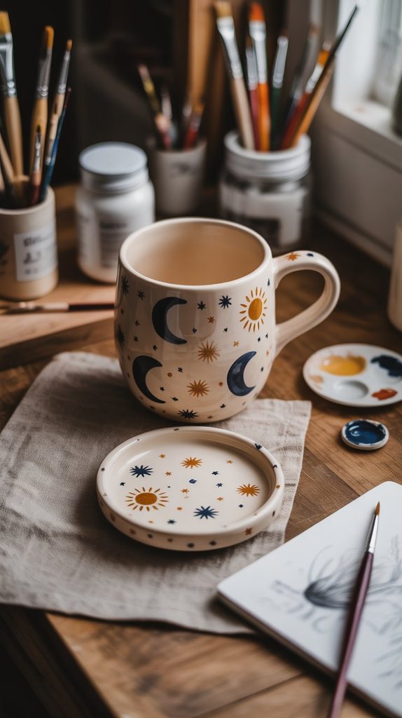 Stars, moons, and little suns are great if you want pottery painting ideas that feel a bit dreamy. This kind of design works really well with navy, mustard, cream, and gold tones.