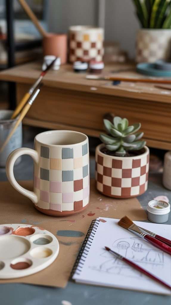 A mini checkerboard pattern in muted colors can make pottery feel trendy and fun. I especially like this on mugs and small planters.