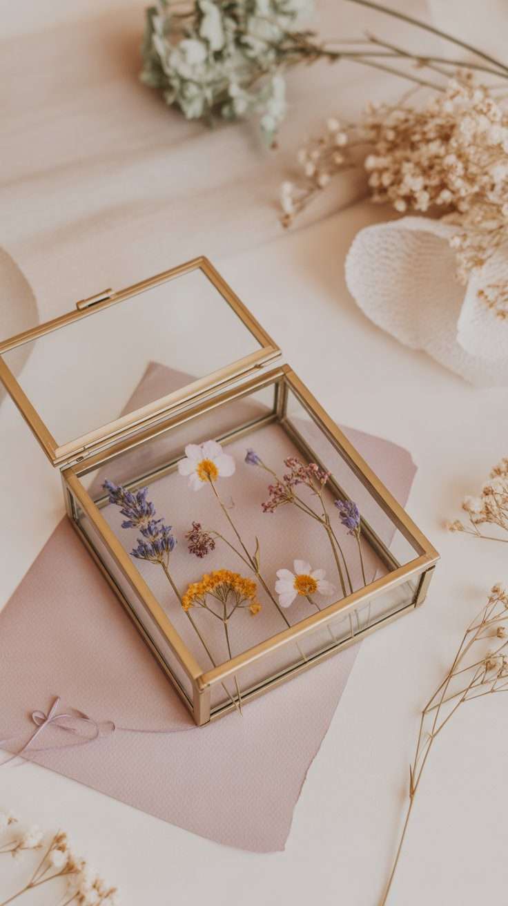 This idea is perfect when the flowers have a memory attached to them. A pressed flower shadow box can hold blooms, leaves, ribbon, small notes, or little keepsakes from a special day.
