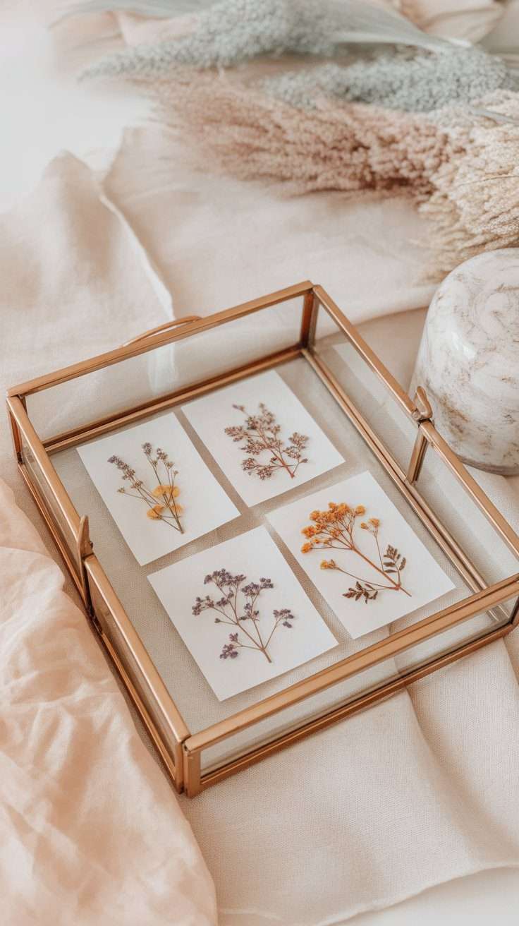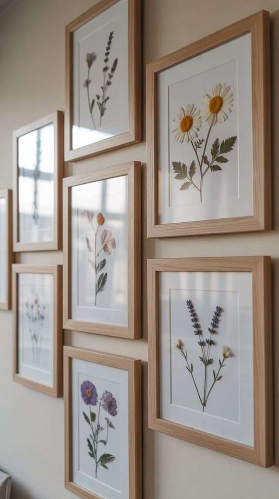 This idea works beautifully when you want several small pieces to feel like one complete decor moment. A pressed flower gallery wall can look soft, botanical, and very personal.
