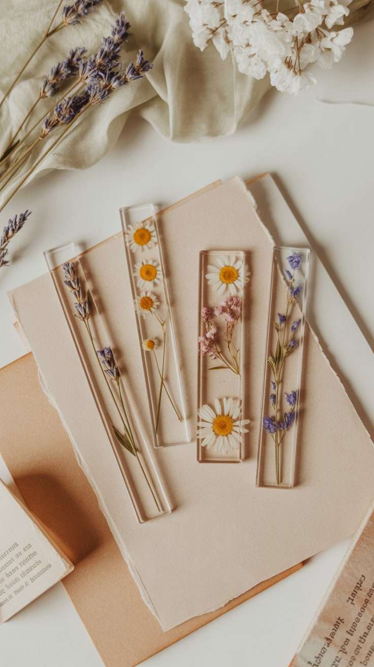 The best materials for this are cardstock, handmade paper, laminating sheets, or clear bookmark blanks. A little ribbon at the top makes them feel finished. This is a great pressed flower art project if you want something small, useful, and easy to gift.