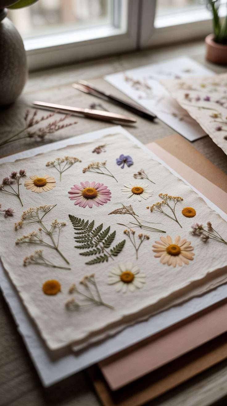 This idea is perfect if you love paper crafts, journaling, or handmade stationery. Pressed flowers on textured paper have that soft, natural look that feels slow and special.