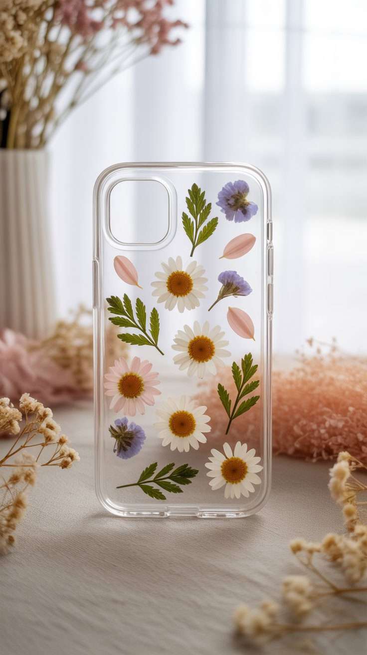 I like this idea because it turns pressed flowers into something you can actually use every day. A clear phone case is the easiest base because the flowers can show through beautifully.
