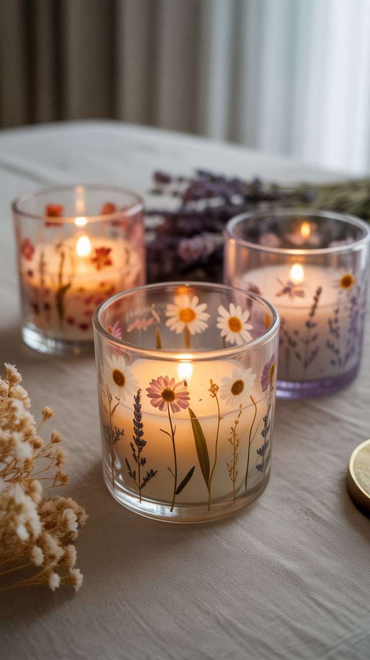 This idea feels so soft and romantic, especially when the candlelight shines through the glass. Small pressed flowers on votive holders or glass jars can create a delicate glow.
