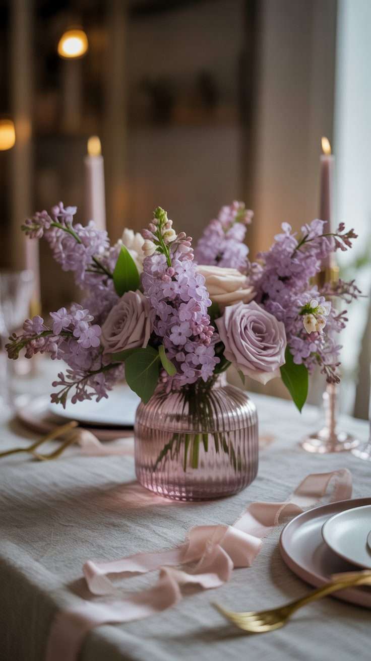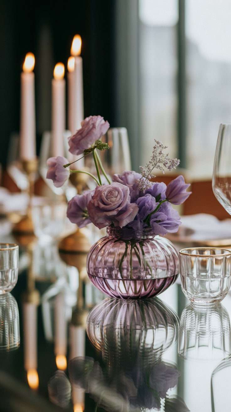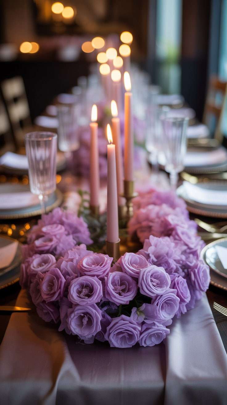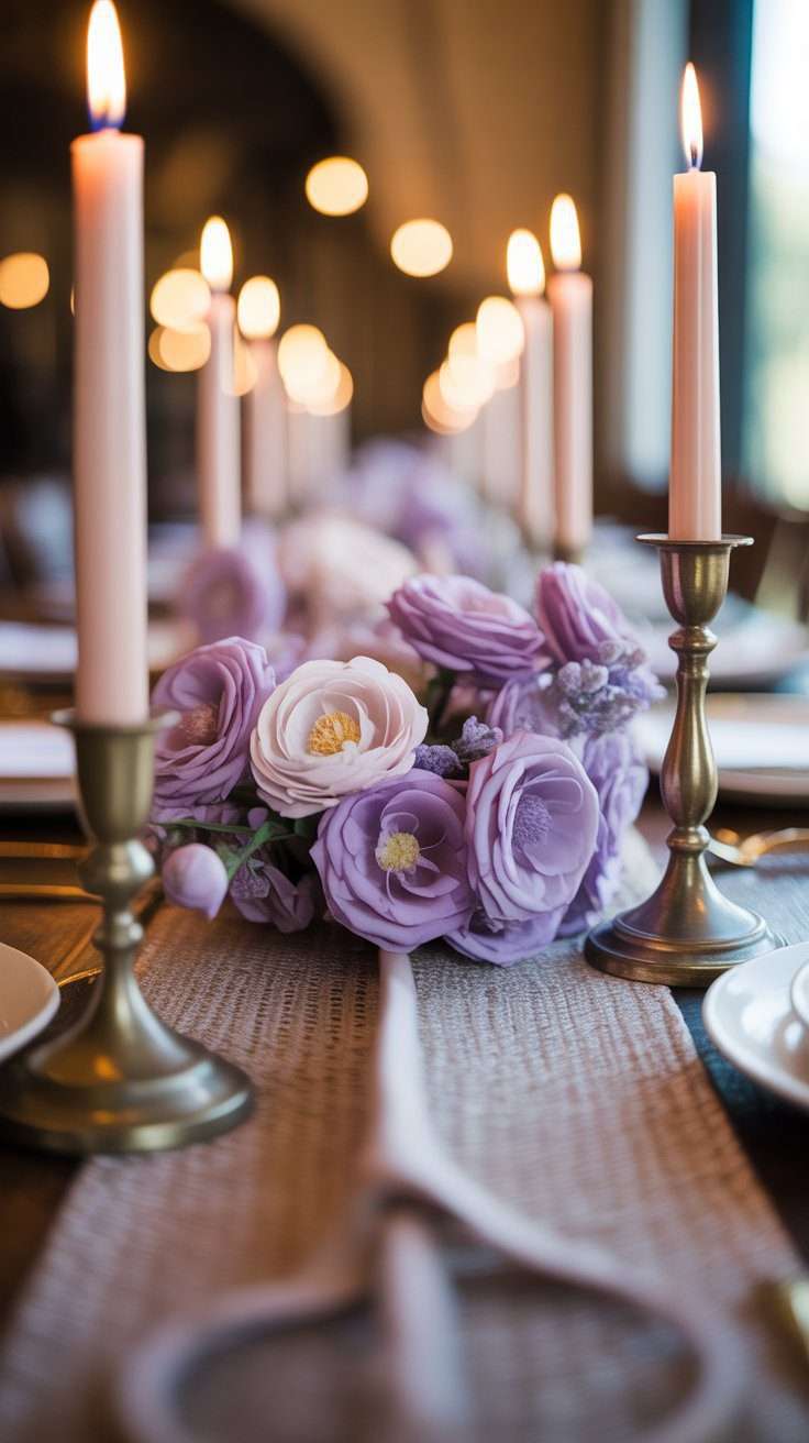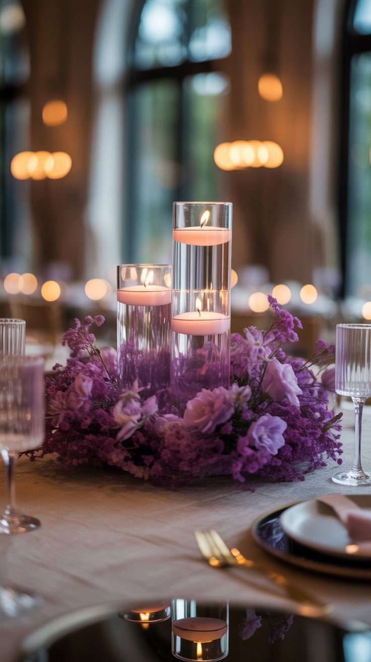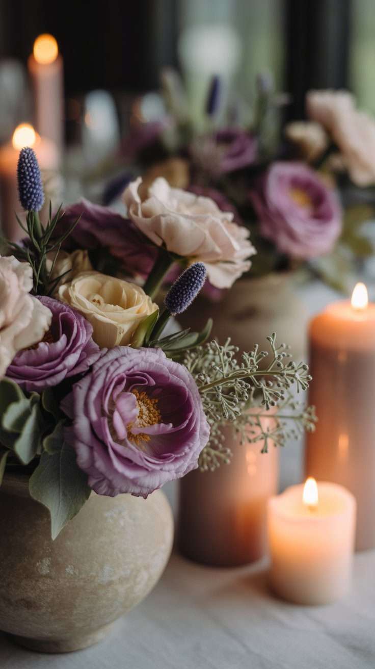 Purple flowers and candles together almost always work. A low arrangement of lavender-toned flowers with white pillar candles feels soft, glowy, and very romantic.