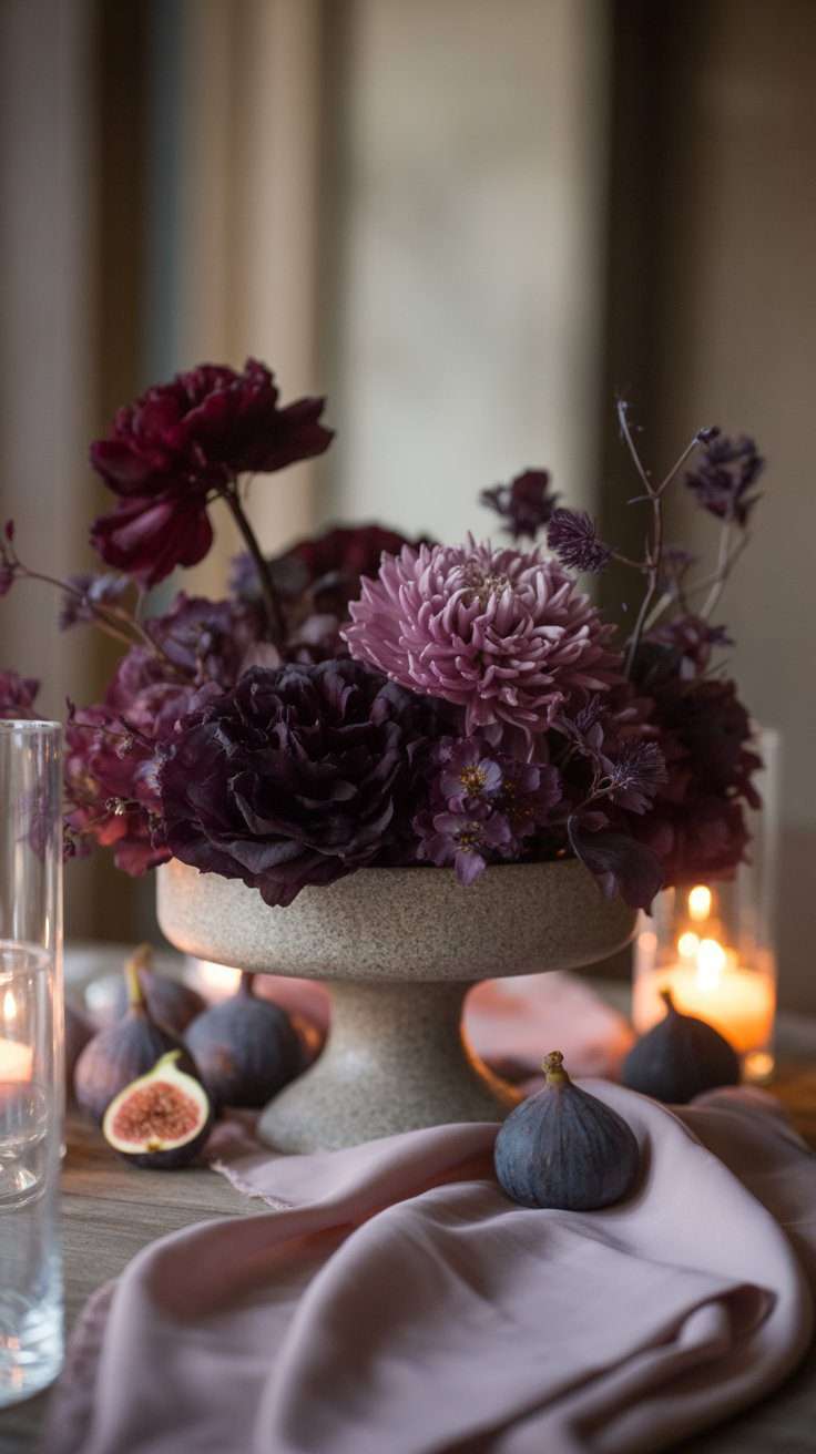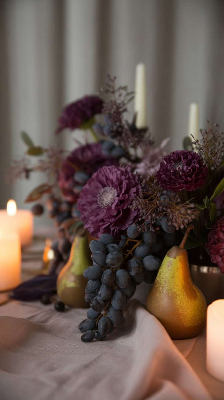 This is such a pretty way to make a centerpiece feel rich and abundant. Purple flowers paired with grapes, figs, or dark pears create that lush, slightly painterly look that feels romantic and elevated.