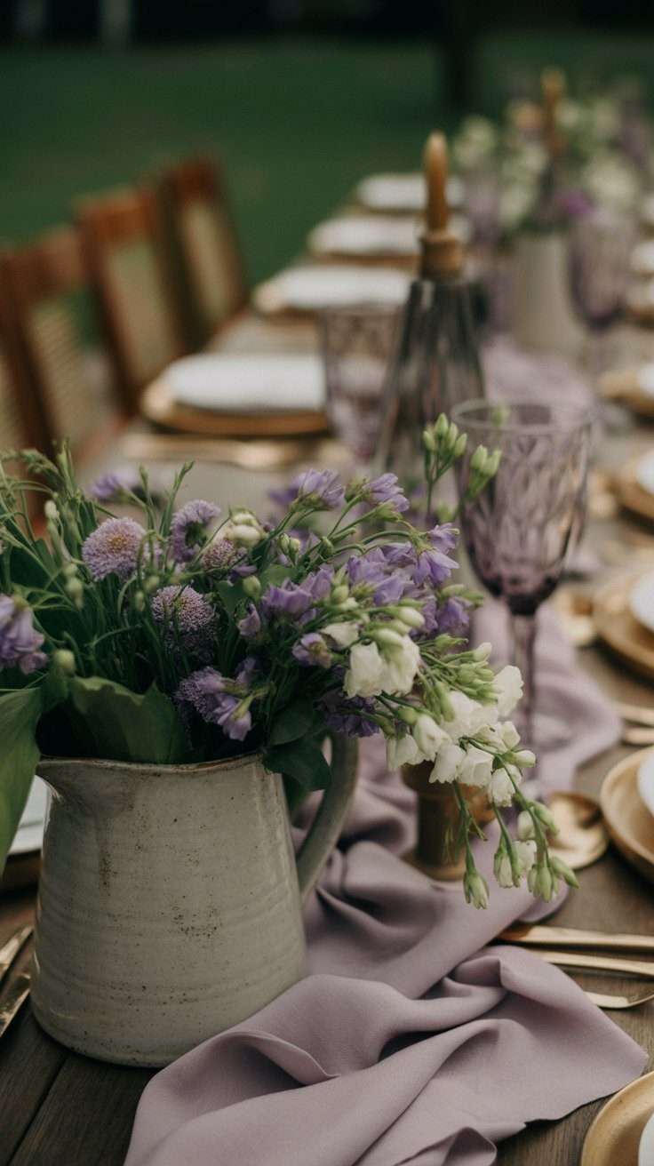Purple flowers mixed with white blooms always feel fresh and balanced. This is a great option if you want color, but still want the table to look light and clean.