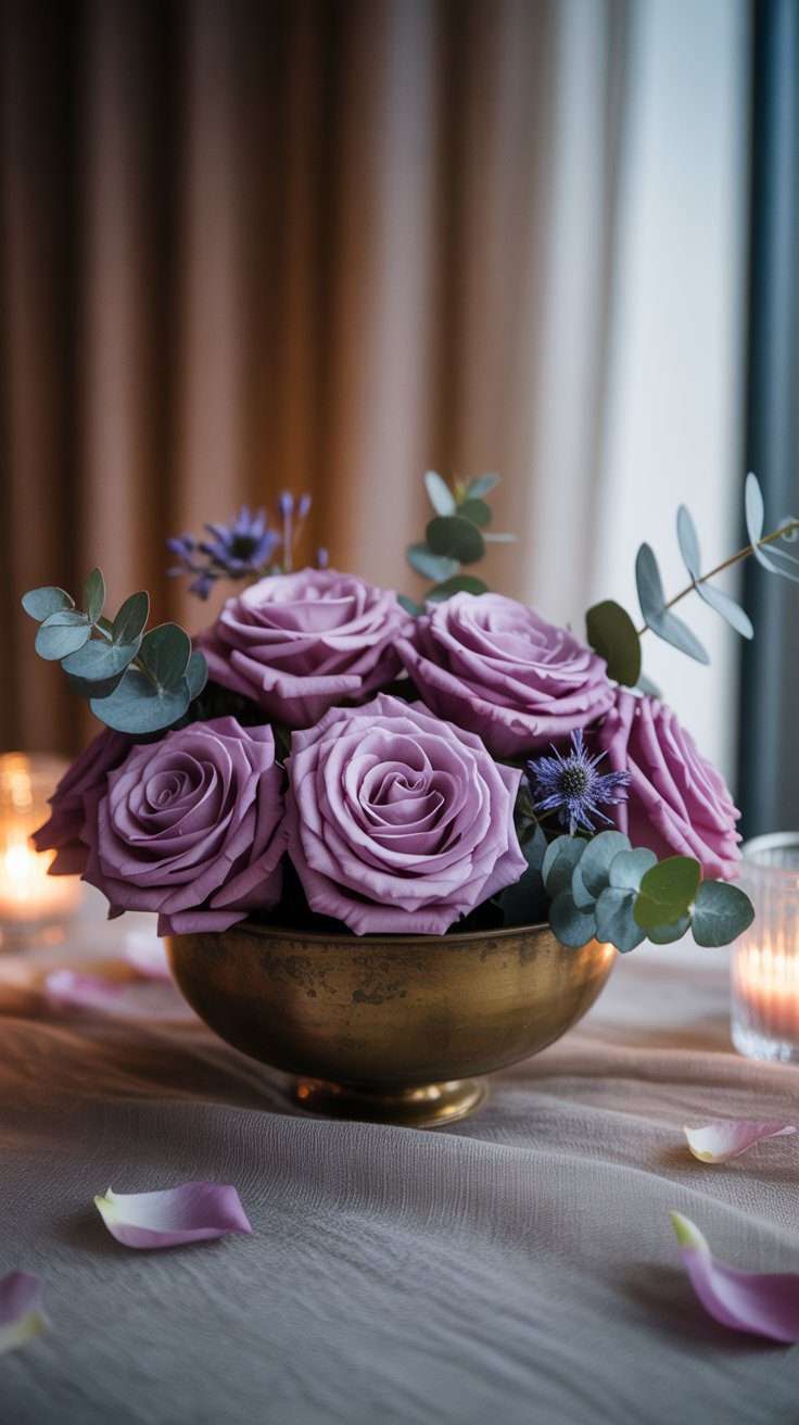 This is one of those centerpiece combinations that always looks expensive. Purple roses already have that romantic, elegant feel, but when you add silver dollar eucalyptus, everything looks softer, fuller, and more styled.