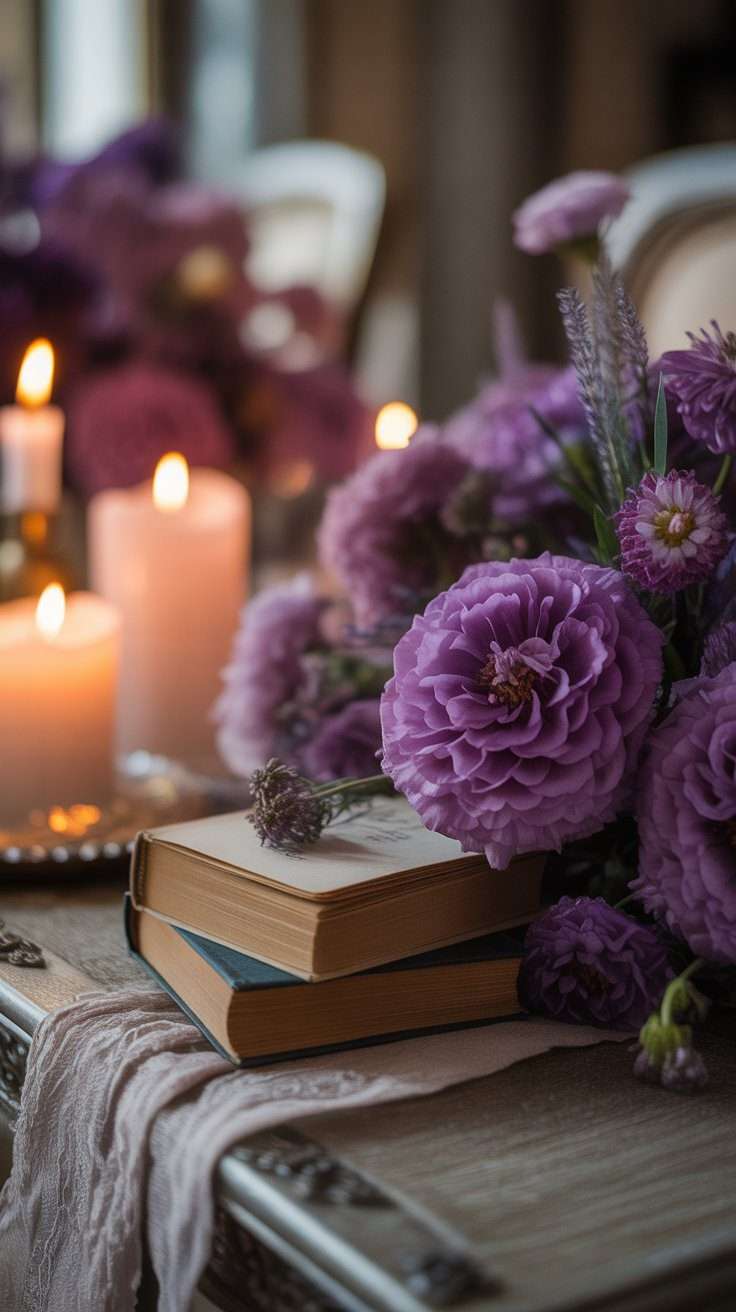 This idea feels romantic in a softer, more collected way. Instead of relying only on florals, you can style purple flowers with a small stack of vintage books and a few candles to give the table more character and texture.